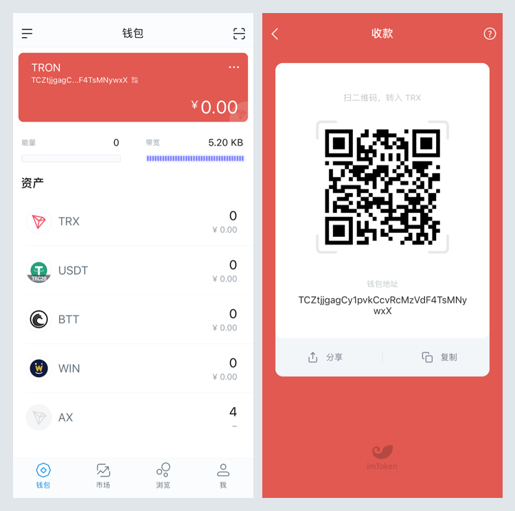 imToken支持哪些币种? 支持ETH、BTC、EOS、TRX以及多种ERC20、TRC20资产。